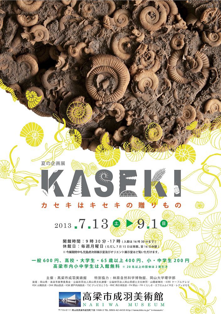 展覧会場には、「ピカピカ」のアンモナイトをはじめ、同じ種類の生物が「うじゃうじゃ」まとまっているもの、「ペチャンコ」になって保存されているものなど、ちがったタイプの化石をたくさん展示します。成羽で発見される2億年前の植物や貝の化石とくらべながら、恐竜・昆虫・哺乳類・・・いろいろな生きもののいろいろな化石を楽しむ夏にしませんか。