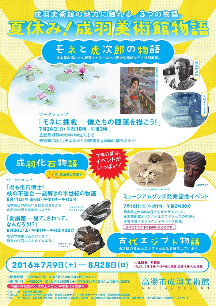 昭和28年に開館した成羽美術館は今年で63年目を迎える、全国的に見ても老舗の美術館です。絵画(美術)、エジプト遺物(考古学)、成羽の植物化石(自然科学)といった異なる分野の優れた展示物が一同に会するのは成羽美術館ならではのこと。今年の夏休み、成羽美術館では『夏休み!成羽美術館物語』と題して、「モネと虎次郎の物語」、「古代エジプト物語」、「成羽化石物語」という三つのテーマで館の魅力を発信します。