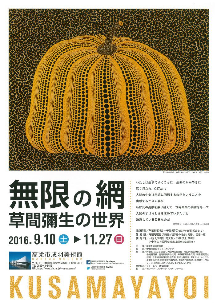 前衛芸術家として世界の美術界の頂点に君臨する草間彌生。1957年に単身渡米し、73年に帰国してから現在に至るまで国内はもちろん世界各国の美術館で大規模な個展を開催、画面全体に網目を描いたモノクローム絵画やソフト・スカルプチャーで高い評価を得てきました。今展ではフォーエバー現代美術館が所蔵するコレクションからオリジナル作品に版画を加え、約140点の作品をご覧いただき草間彌生の世界をご紹介します。