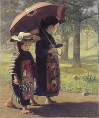 Home 虎次郎の生涯 [ 出会い ] [ 出会い ] 2018.04.1 虎次郎の生涯 -念願かない上京、美術学校へ入学。勉学にいそしみ、その才能を開花させていく。そして大原孫三郎との出会い。 明治34年、虎次郎は念願かない絵画修業のため上京しました。それまで画家志望に反対していた祖父母も親戚・知人等の熱心な説得の末、東京遊学を許してくれたのでした。東京では早朝より近郊へ写生に出掛け、昼は東京美術学校(美校、現 東京藝術大学)受験準備のため画塾へ通う、という勤勉な生活ぶりでした。そのかいあって翌年、無事に美校西洋画科選科への入学を果たし、画学生として本格的に西洋画を学ぶこととなったのです。同校に西洋画科が新設されて6年目、主任教授に黒田清輝、助教授に藤島武二らがいました。虎次郎は1年の時、高梁市出身の弁護士 桜井熊太郎により大原家の奨学生に推薦されています。帰郷の折、紹介状と数点の作品を持って大原家を訪ね、そこで1歳年長の大原孫三郎と初めて対面します。虎次郎にとっては、まさに運命の出会いでした。その28年後、日本で最初のまとまった西洋美術コレクションを蔵する大原美術館(倉敷市)は、孫三郎と虎次郎の信頼と友情の結晶として誕生したのでした。 大原家の奨学生として物心両面の支援を受けた虎次郎は、生来の勤勉さもあってか更に熱心に勉学に励み、全国から画家を志す俊英が集う美校でも、本来4年の就学を2度の飛び級により2年で修了してしまい、明治37年に卒業、引き続き研究科に学ぶことになりました。研究科の卒業制作として明治39年に描かれた《登校》は、美校で学んだものを集大成した初期の代表作の一つといえます。 帽子を被り、道端で摘んだのか紫苑の花を持って、ものうげな表情で歩く妹。大きな日傘をさし、うつむき加減でくさむらにとまった赤トンボを見つけた姉。背景の朝日に包まれた緑の木立をやさしい色使いで表現し、人物には抜群の描写力をうかがわせています。光を逆光として取り入れることで、子供の微妙な表情や、皮膚の質感が強調され、穏やかな情感あふれる作品に仕上がっています。明治40年、虎次郎は東京府主催勧業博覧会美術展で華々しい画壇デビューを果たしました。出品作《なさけの庭》は1等賞を受賞し、宮内省御買い上げの栄誉も受けたのでした。この活躍は虎次郎の大きな飛躍の契機となりました。援助者の大原家の計らいで西洋画の本場ヨーロッパへの留学を許されたのでした。 ➔ 第三章「旅立ち」 へ コメント コメント ( 0 ) トラックバック ( 0 ) この記事へのコメントはありません。 この記事へのトラックバックはありません。 返信をキャンセルする。 名前( 必須 ) E-MAIL( 必須 ) - 公開されません - URL Δ