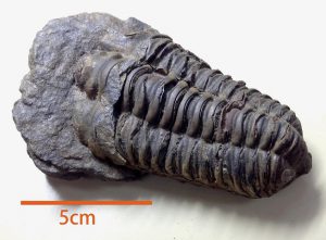 これは、三葉虫の殻と同じ凹凸を残した(上図のBのほう)印象化石です。三葉虫は、一般的に体の殻が化石になりますが、殻自体が残っていないことも多く、印象化石も多い生き物です。生きていればたくさんあったはずの脚や触覚は、殻よりも腐って(または溶けて)なくなりやすく、印象としても残っていることはほとんどありません。