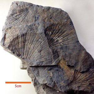 成羽から産出する、モノチスという二枚貝の殻の印象化石です。モノチスの殻は非常に薄いために消失しやすいと考えられ、成羽産出のモノチス化石は、ほぼ100%が印象化石です。