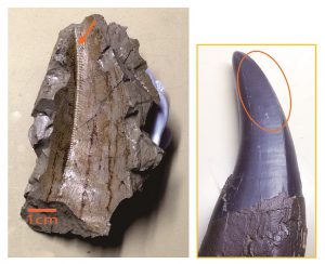 これは、ティラノサウルスの歯の跡が埋まっていた岩石に写し取られたものです。よくみると、歯の鋸歯といわれるギザギザの跡(矢印)も残っています。