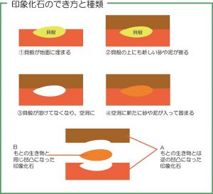 印象化石には2種類あって、図のようにもともとの生き物の凹凸とは逆の印象化石(A)と、その化石に砂や泥が入って固まった、生き物と同じ凹凸の形を残した化石(B)があります。