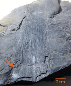 成羽から産出する植物化石で、今はもう絶滅してしまった大型のトクサ(春にツクシを伸ばすスギナの仲間)の茎の部分です。太い茎の縦縞模様や節(矢印)まではっきり残っています。