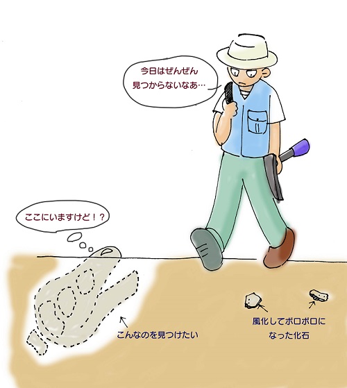 化石の発見は、気力、体力、観察力、そして時の運もあるのです。