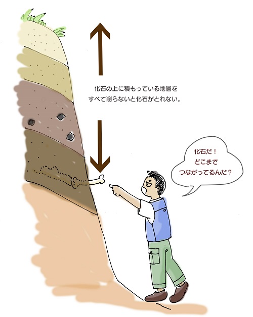 とはいえ、日本のように地層の露出が少ない場所では、図のように切り立った崖(つまり、地層の断面)で化石が見つかることがよくあります。これが大型の化石であれば、奥に相当掘り進まないと取り出せないため、発掘作業は長期におよびます。