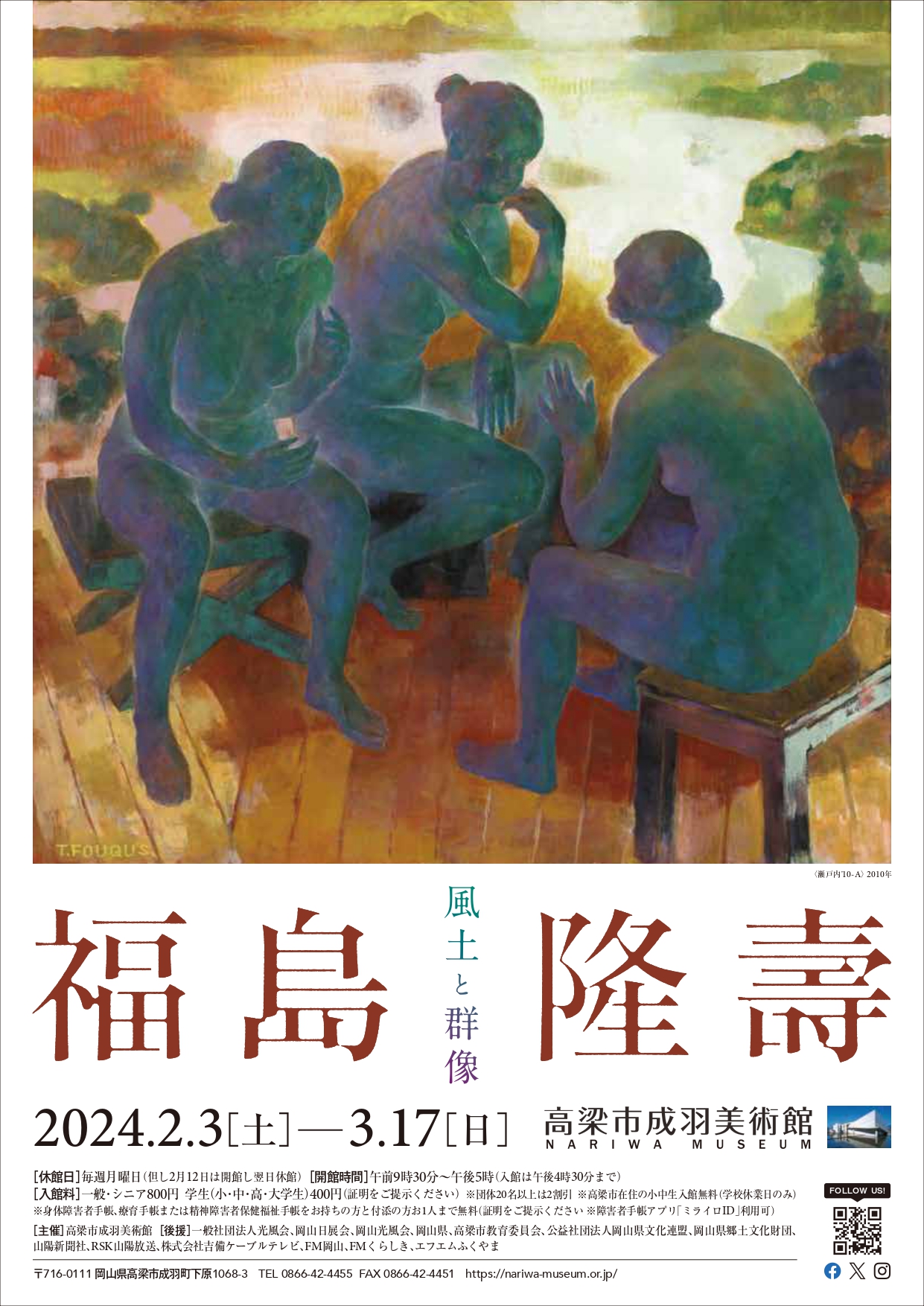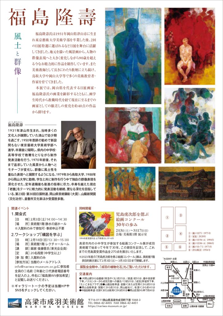 福島隆壽氏は1931年岡山県津山市に生まれ東京藝術大学美術学部を卒業した後、2回の日展特選に選ばれるなど日展を舞台に活躍してきました。地元を描いた風景画から人物の群像表現へと大きく変化しながら90歳を超える今なお精力的に作品を制作しています。また美術教師として長きにわたり教壇に立ち続け、鳥取大学や岡山大学等で多くの美術教育者・作家を育ててきました。本展では、岡山県を代表する日展画家・福島隆壽氏の画業を顕彰するとともに、画学生時代から教職時代を経て現在に至るまでの画家としての眼差しの変化を約40点の作品から探ります。